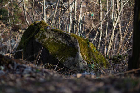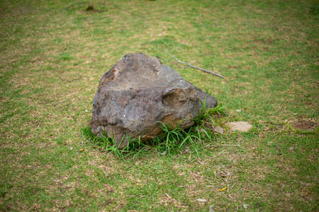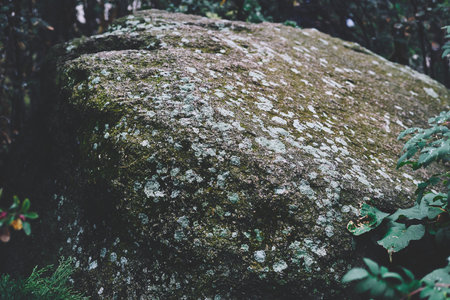 A large stone covered with moss lies in the grass. A huge boulder overgrown with moss in the backyard