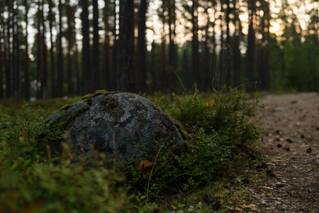 An enormous, jagged stone spans across a deserted woodland path, enveloped by towering, mist-shrouded pines, conjuring an unsettling silence at dawn?s first light.