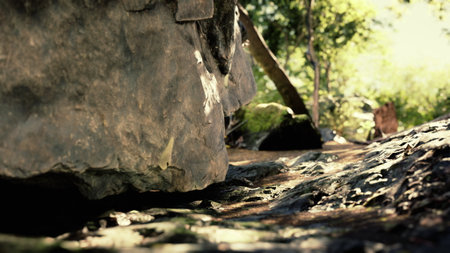 Amidst a tranquil forest, sunlight streams through lush trees, casting dappled shadows on rugged rocks. A sense of calm prevails as nature reveals its secret trails.