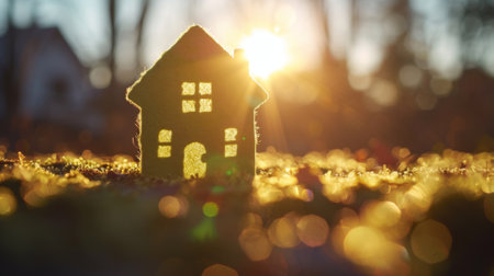 Small model house standing on moss at sunset symbolizing eco friendly home
