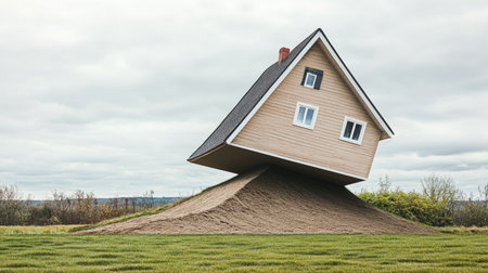 A creatively designed house stands tilted on a sandy slope, surrounded by lush green grass and under a moody, cloudy sky, evoking intrigue and wonder.