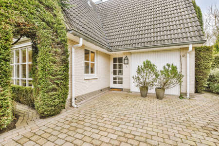 Charming brick cottage with tiled roof surrounded by lush greenery and garden shrubs in a serene outdoor setting.