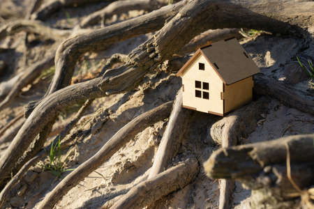 Tiny toy house standing among large and strong tree roots on a sandy shore. Family home concept.