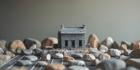 AI Generated. Grey Stone Miniature Building with Grid and Rocks