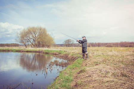 Fisherman trying to do a perfect cast, throwing lure. Spining fishing, angling, catching fish. Hobby and vacation.