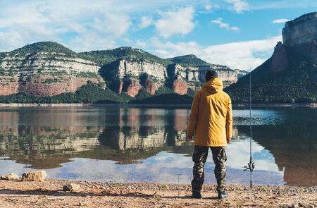 fisherman hold fishing rod, man enjoy hobby sport on lake, person catch fish on river on background mount, fishery concept