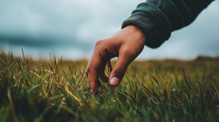 Fingers delicately tracing the lines of blades of grass under an overcast sky