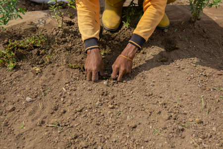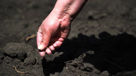 Planting a sprouted seed in the ground, theme garden and vegetable garden.