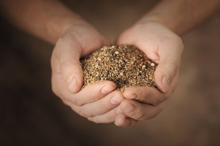 Soil in farmer arms over good brown soil background. Agriculture, organic gardening, planting or ecology concept. Environmental, earth day. Farmer is checking quality before sowing.