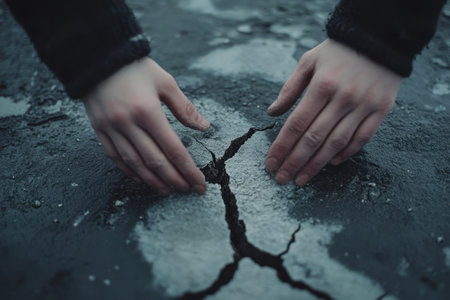 Two hands rest gently on the cracked pavement, highlighting the fragility of urban environments at dusk.