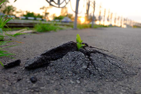 Small and green plant grows through urban asphalt ground. Green plant growing from crack in asphalt on road. Space for text or design.
