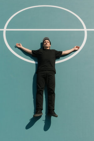 Young man relaxing on basketball court painted surface in casual black outfit.