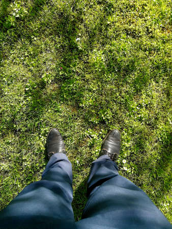 Black leather shoes and formal trousers standing on the green grass during summertime