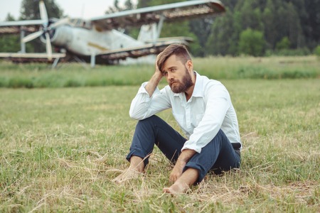 Man in cap and glasses sitting on the field, young man in glasses sitting on the grass in the field