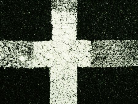 White paint line on old obsolete asphalt plaground. Empty kids areal.