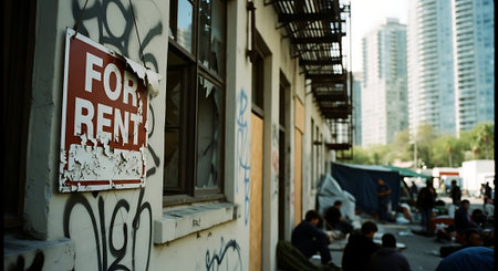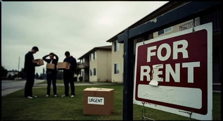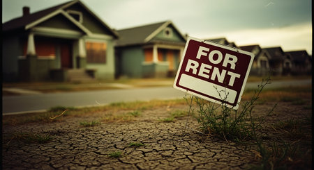 Bright red 'For Rent' sign stands prominently in front of stylish apartment buildings, highlighting urban lifestyle and available rental options in a vibrant neighborhood, AI generated