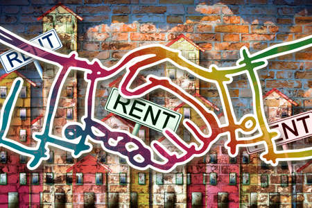 Real estate concept image with colorful cartoon doodles background design, placards with written rent on it and handshake on foreground
