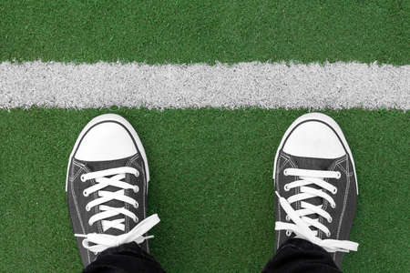 White sneakers on the grass. View from above. The concept of a healthy lifestyle.