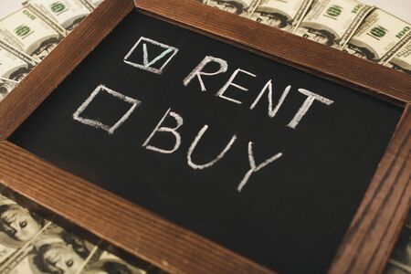 chalkboard with rent and buy lettering near cup of coffee, plant, smartphone with blank screen and money
