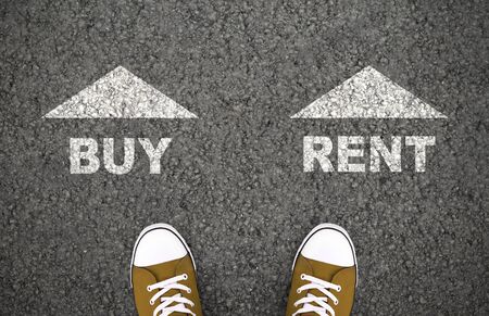 Dilemma Concept, Buy or Rent. One unable to make a decision, standing on a crossroad, top view