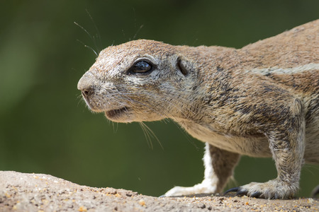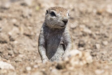 Close up of cape ground squirrel or South African ground squirrel, or Geosciurus inauris, searching for food in Kgalagadi Transfrontier Park, South Africa