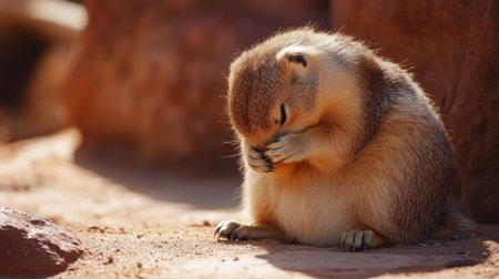 A charming rodent sits quietly in its natural habitat, showcasing a playful expression while resting its paws over its face, creating a delightful moment.