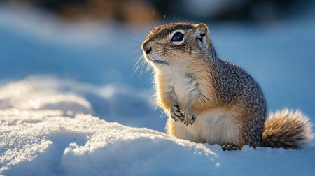 Ground squirrel sitting on snow illuminated by sunlight in winter. Wildlife and nature photography concept
