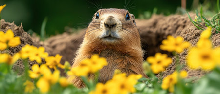 Curious groundhog peeking out from a burrow, surrounded by yellow wildflowers