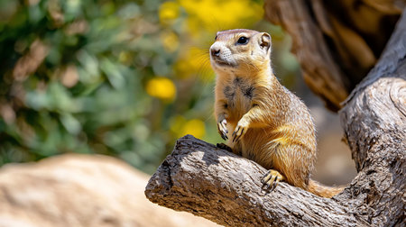 A prairie dog sits alertly on a weathered branch, its fur detailed in the sunlight, against a blurred background of green foliage and yellow flowers.