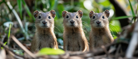 Three young mongooses stand together in a verdant landscape surrounded by leaves and twigs enjoying their time in the wild.