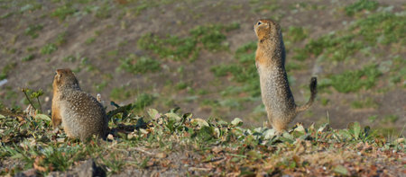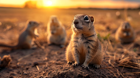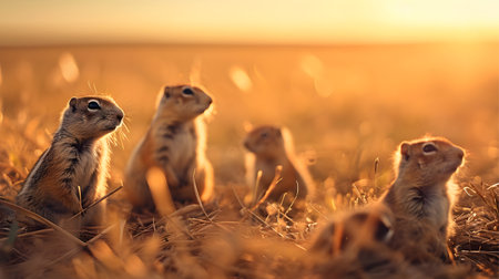 Ground squirrel family in the harvested field in summer evening with setting sun. Group of wild animals in nature. Horizontal, banner.