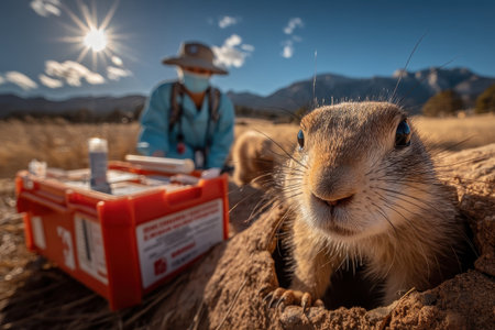 A prairie dog pops out of its burrow while a veterinarian tends to wildlife in the background under a stunning sunset