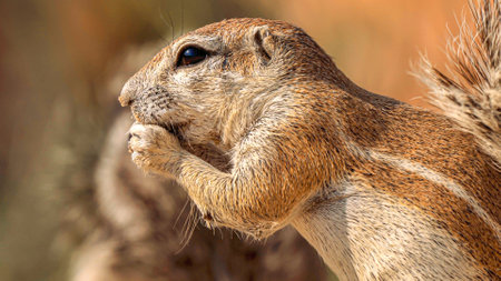 A detailed close up wide angle portrait macro shot of a ground squirrel, eating a nut in the Madikwe Game Reserve, South Africa.