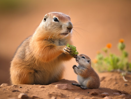 An adult prairie dog nuzzles its young baby amidst green foliage and flowers.