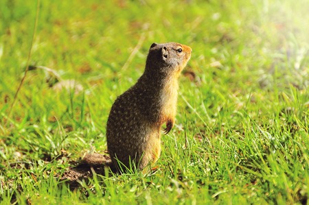 Gopher on the lawn. Close-up. Portrait of an animal.