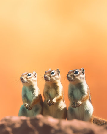 Three ground squirrels standing on top of each other on orange background