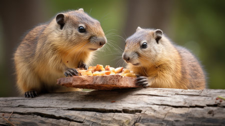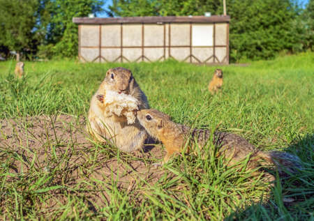 Two gophers on the meadow is eating a piece of bread