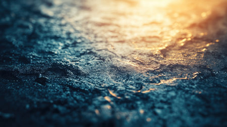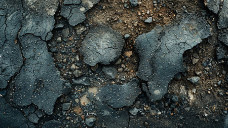 Detailed macro shot of a cracked asphalt road, highlighting rough textures and deep fissures with subtle light reflections on the uneven surface.