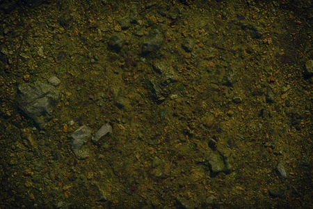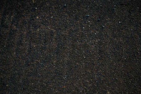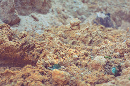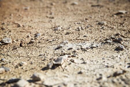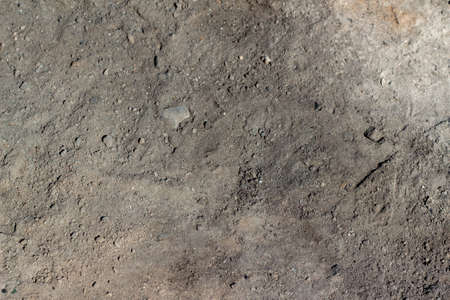 Close-up of ground with dirt and sand soil in random with small stones. Randomly sketched dirty loose coarse sand interspersed with debris and small gravel