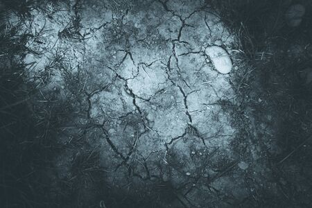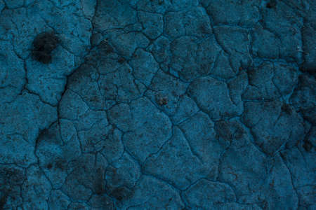 Texture of the dried earth. Dark blue background with cracks and hollows. Drought and lack of moisture in the soil. The consequences of abnormal heat. Environmental disaster. Global warming.