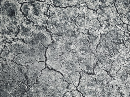 Detailed closeup of textured cracked earth surface showing the environmental problem of drought and desiccation due to climate change, with dark tones and moody background
