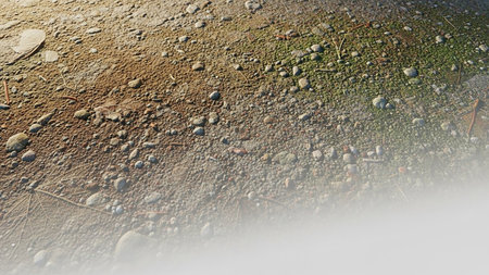 Detail showing close up view of rough ground with small pebbles dirt and scattered dry leaves with a soft white gradient fading into the foreground keywords:...