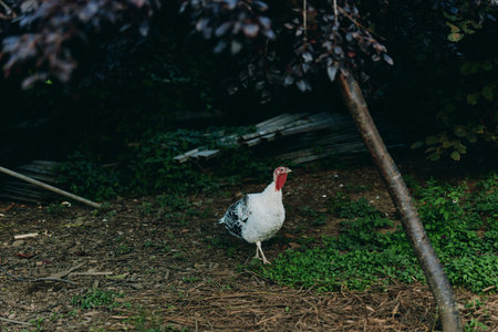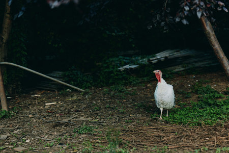 White turkey, domestic turkey, adult turkey, bird standing in shaded rural backyard, calm and alert, walking on dirt and grass near trees, farm animal portrait for agriculture.