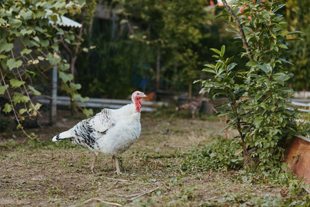 Turkey, farm, bird, outdoor, white, male, walking, rural. Adult tom turkey standing in a backyard garden, calm and alert, white plumage with black markings, natural farm livestock scene.