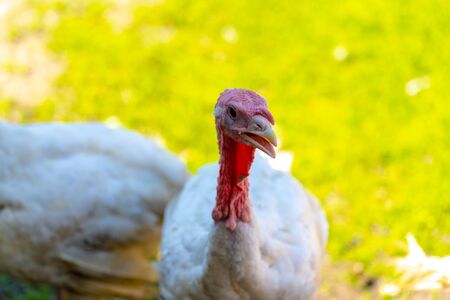 Breeding turkeys on a farm. White turkey portrait. Flock of Turkeys at the farm. Pasture raised turkey on a farm