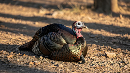A wild turkey with iridescent dark feathers and a textured red and blue head sits on the ground in dappled sunlight. The bird is resting in a natural outdoor environment with a blurred background.
