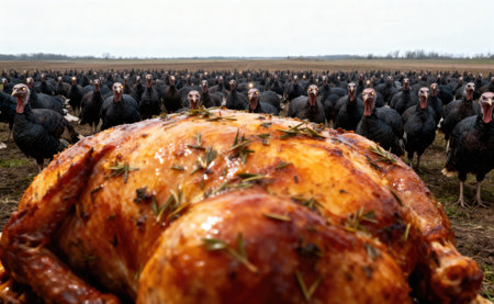 A close up of a roasted turkey is in front of a large group of turkeys, creating a humorous scene