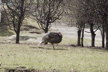 turkey bird stands on the farm, on the grass. the turkey runs on the yard