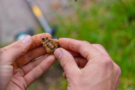 Fishing in the autumn. Fisherman prepares bait for feeder fishing.