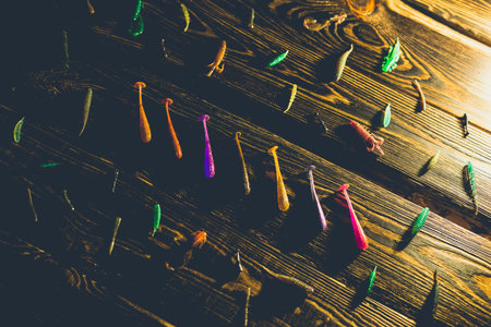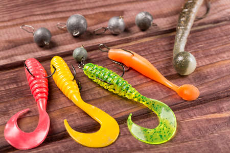 Colourful silicone fishing baits with plummets , close-up on wooden table. Selective focus.